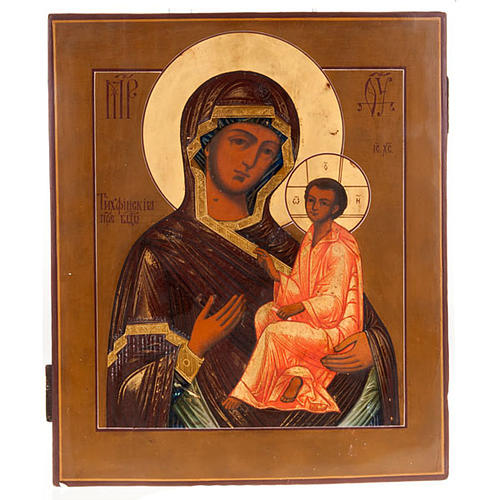Icône ancienne du XIX siècle réalisé en Russie. L'image de la vierge mère de Dieu de Tichvin est une des images les plus vénérées en Russie. L'histoire raconte de la première apparition en 1383 près de Novgorod, trois autres apparitions suivirent : une sur le fleuve Tichvinc où fut construite l'église dédiée à la Vierge et en 1560 le monastère Tichvinski. Durant l'occupation du 1941 l'icône fut prélevée et transportée en Allemagne et ensuite aux Etats Unis où fut conservée à Chicago, dans l'église dédiée à Pierre et Paul. En 2004 l'icône à été rendue à la Russie et placée dans le monastère de Tichvin. Dans l'icône la vierge avec la main droite indique le fils pour dire que le chemin à suivre est celui qui conduit vers Dieu. L'enfant Jésus bénit les fidèles avec la main droite. L'icône est revêtue de " riza ", un étui métallique formé d'une lamine dorée, décorée, avec des détails en relief. Chaque icône est accompagnée d'une photo avec détails relevés par les experts du Ministère de la culture russe. Pour les visualiser, cliquez ici.