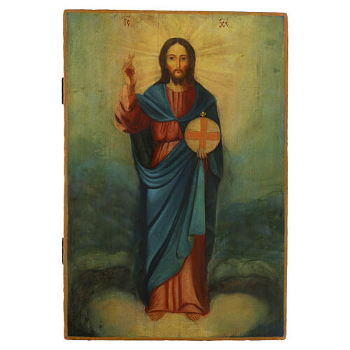 Cette icône représente Jésus en position frontale et hiératique, bénissant l'audience selon le rite orthodoxe byzantin. Avec la main droite, il bénit les fidèles, tandis que de sa main gauche, il tient l'univers, symbole de son autorité divine. Son auréole comporte les lettres grecques traditionnelles « Celui qui est », soulignant la nature éternelle du Christ. Son visage expressif illustre le mystère de Dieu incarné, avec les caractér...