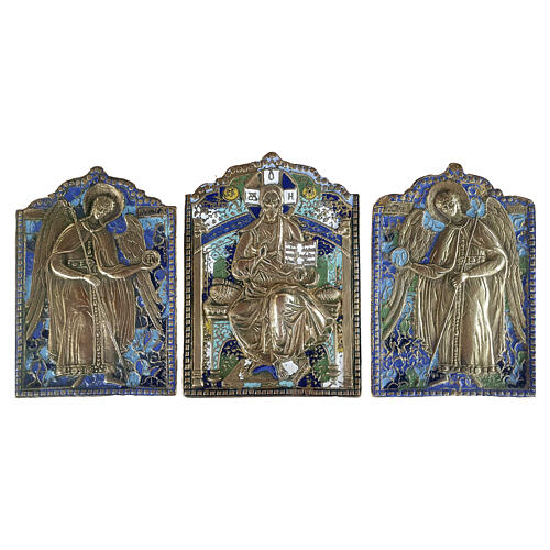 Icône russe ancienne XIXe siècle triptyque Déisis archanges Michel et Gabriel bronze émaillé 22x15,8 cm.