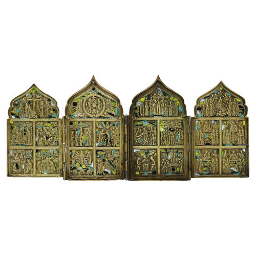 Petit polyptyque russe ancien en bronze, précieux témoignage de la dévotion orthodoxe, présentant une structure pliable à quatre volets ornés de scènes sacrées. Ces icônes portatives, souvent utilisées par les pèlerins et les voyageurs, servaient de petits autels personnels, faciles à transporter et durables grâce au métal ; elles accompagnaient la prière quotidienne et offraient protection spirituelle en chemin.