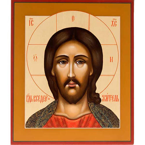 Icône Russe peinte à la main du Christ Pantocrator en gros plan. Cette icône représente le Christ Pantocrator avec regard pénétrant.