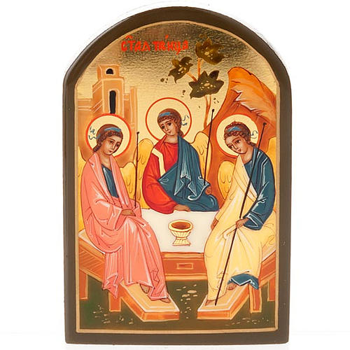 Icône russe scène de la sainte trinité. Elle représente la scène de la sainte trinité. Icône réalisée par les maitres de l'école russe de Palekh, une ville au nord de la Russie. Chaque détail est réalisé selon la technique de la loupe qui permet le soin dans les moindres détails. L'icône est peinte à la main sur bois avec couleurs à l'oeuf et feuille en or. Elle est enfin passée avec de la laque selon la technique de l'iconographie russe. L'image est peinte sur le tissu et ensuite posée sur le bois. Particulière avec la partie supérieure arrondie. Accompagnée de certificat d'origine.