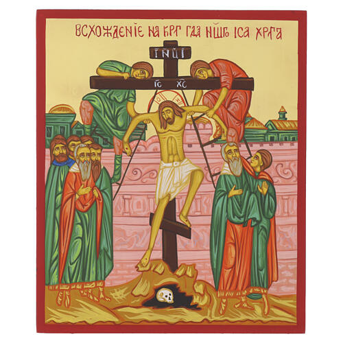 La scène représente le moment de la déposition du Christ de la croix : le corps de Jésus est descendu et soutenu par les personnages présents au Golgotha.