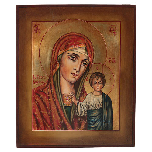 Icône Vierge de Kazan style russe peinte bois tilleul 32x26,5 cm. Icône de la Vierge de Kazan en bois de tilleul peinte à la main à la détrempe par des artisans polonais selon les techniques iconographiques traditionnelles russes, couverte de feuille d'or plaquée et vieillie.Livrée avec certificat de garantie et histoire de l'icône.Article de production artisanale : certains détails pourraient différés de la photo.