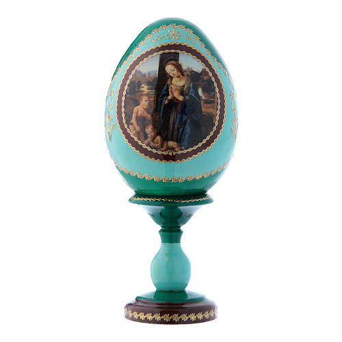 Oeuf vert en bois russe Adoration de l'Enfant avec Saint Jean-Baptiste h tot 16 cm. Oeuf russe de couleur vert en découpage avec reproduction de "Adoration de l'Enfant avec Saint Jean-Baptiste" de Lorenzo di Credi, hauteur total 16 cm (oeuf 11 cm).
