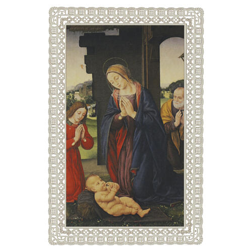 Image pieuse Nativité avec adoration en extérieur 12x7 cm bord effet dentelle