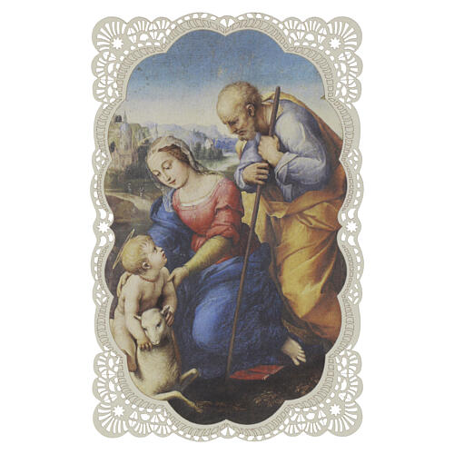 Image pieuse Vierge à l'Enfant et Saint Joseph dans les champs 12x7 cm bordure dentelée.