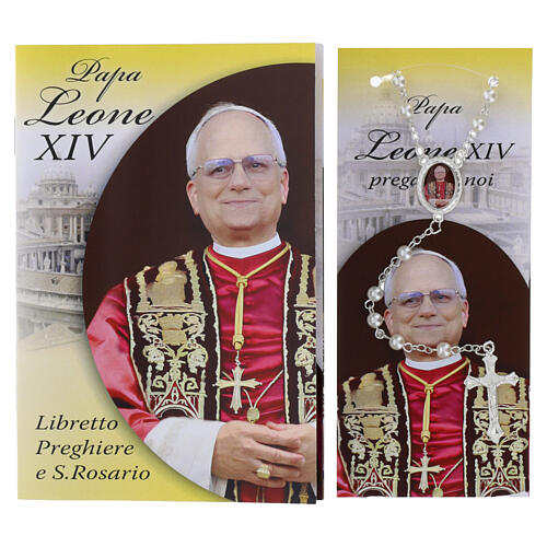 Set composé d'un livret pliant contenant les prières et le Saint Rosaire en italien, d'un chapelet en plastique avec médaille décorative et d'un marque-page plastifié portant l'image du Pape Léon XIV.