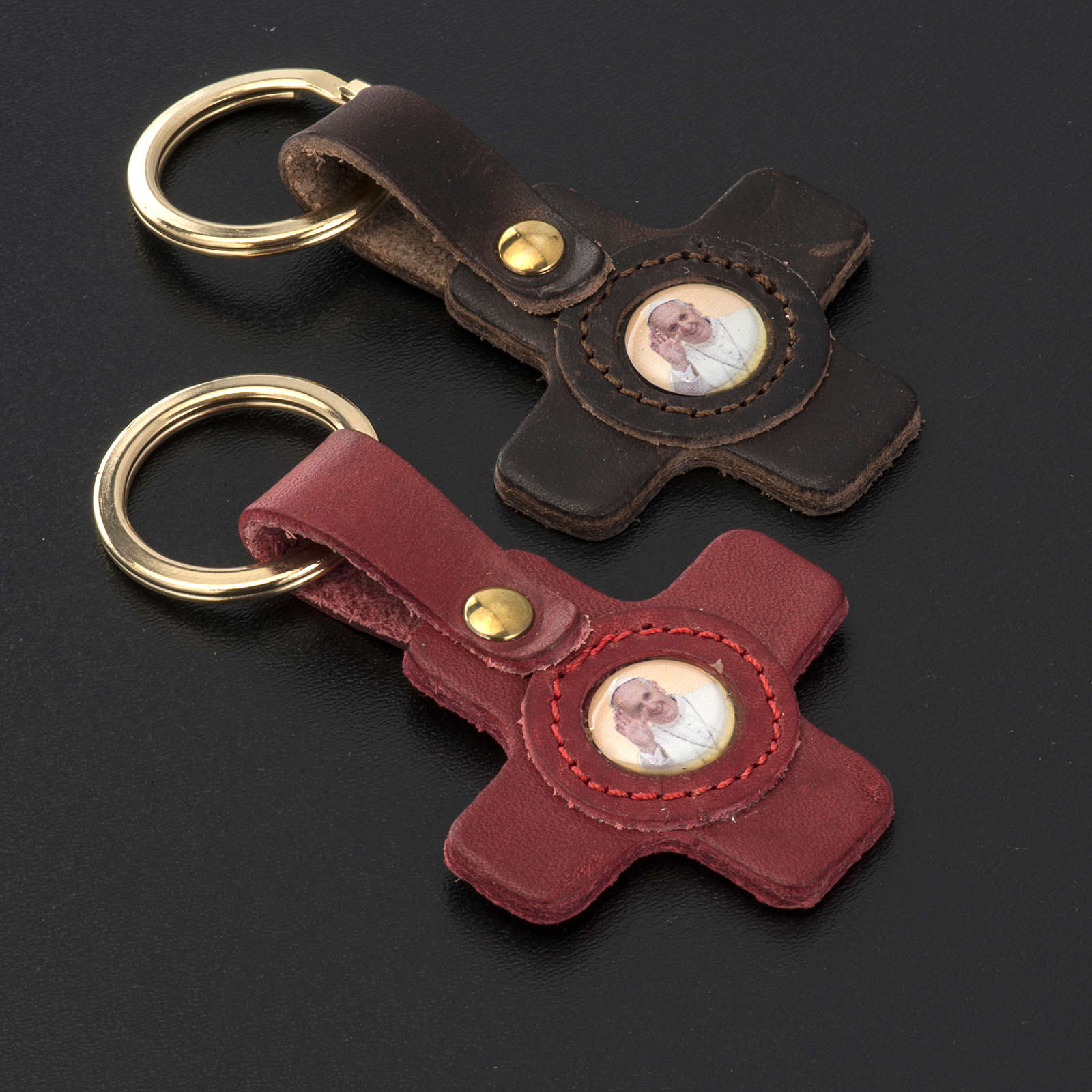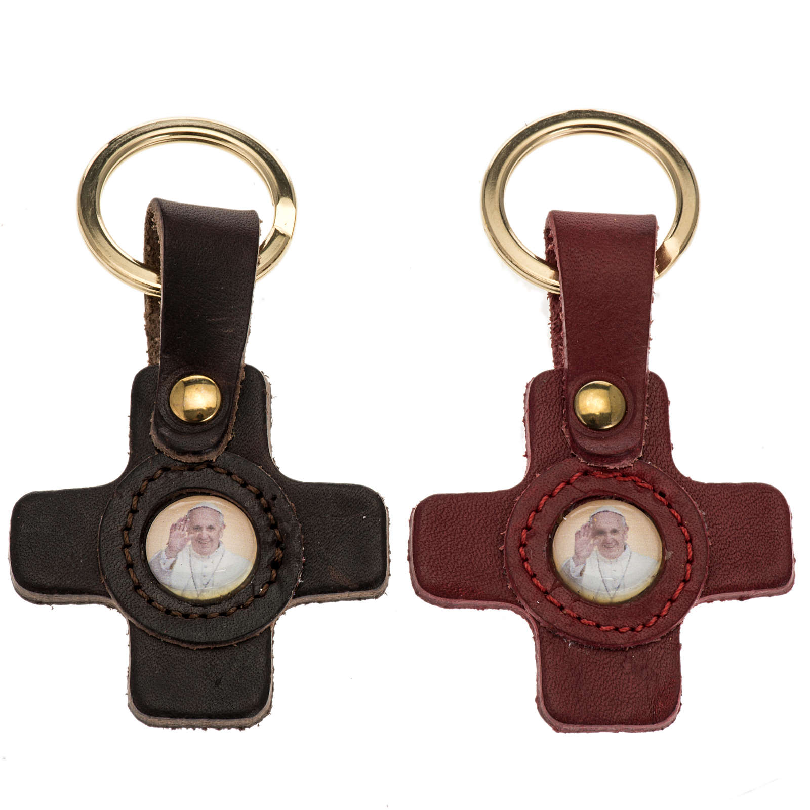Porte clé en forme de croix avec image du Pape Francois. Porte clé réalisé en cuir dans une maroquinerie italienne.