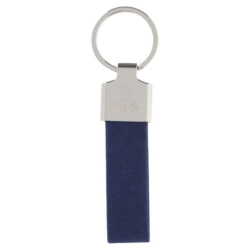 Porte-clé avec bande en tissu technique bleu et plaquette métallique gravée représentant la Vierge Marie.