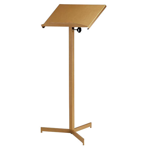 Pupitre à colonne en fer doré. Le pupitre est réalisé avec du vernis couleur or et avec une base de trois pieds. Dimensions: 43x28 cm. La hauteur de la colonne est réglable de 100 cm à 145 cm. Réalisation du pupitre en Italie ans une entreprise italienne avec une forte expérience dans le décor du métal et des produits sacrés. Les matériaux utilisés sont d'origine italienne. Chaque produit est réalisé de manière artisanale.