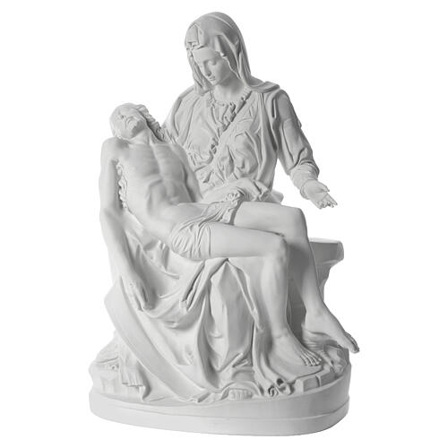 Statue Pietà marbre synthétique 100 cm. Statue de la Pietà en poudre de marbre de Carrare et résine, garantissant une statue de haute qualité et très résistante, adaptée pour l'exposition en extérieur.