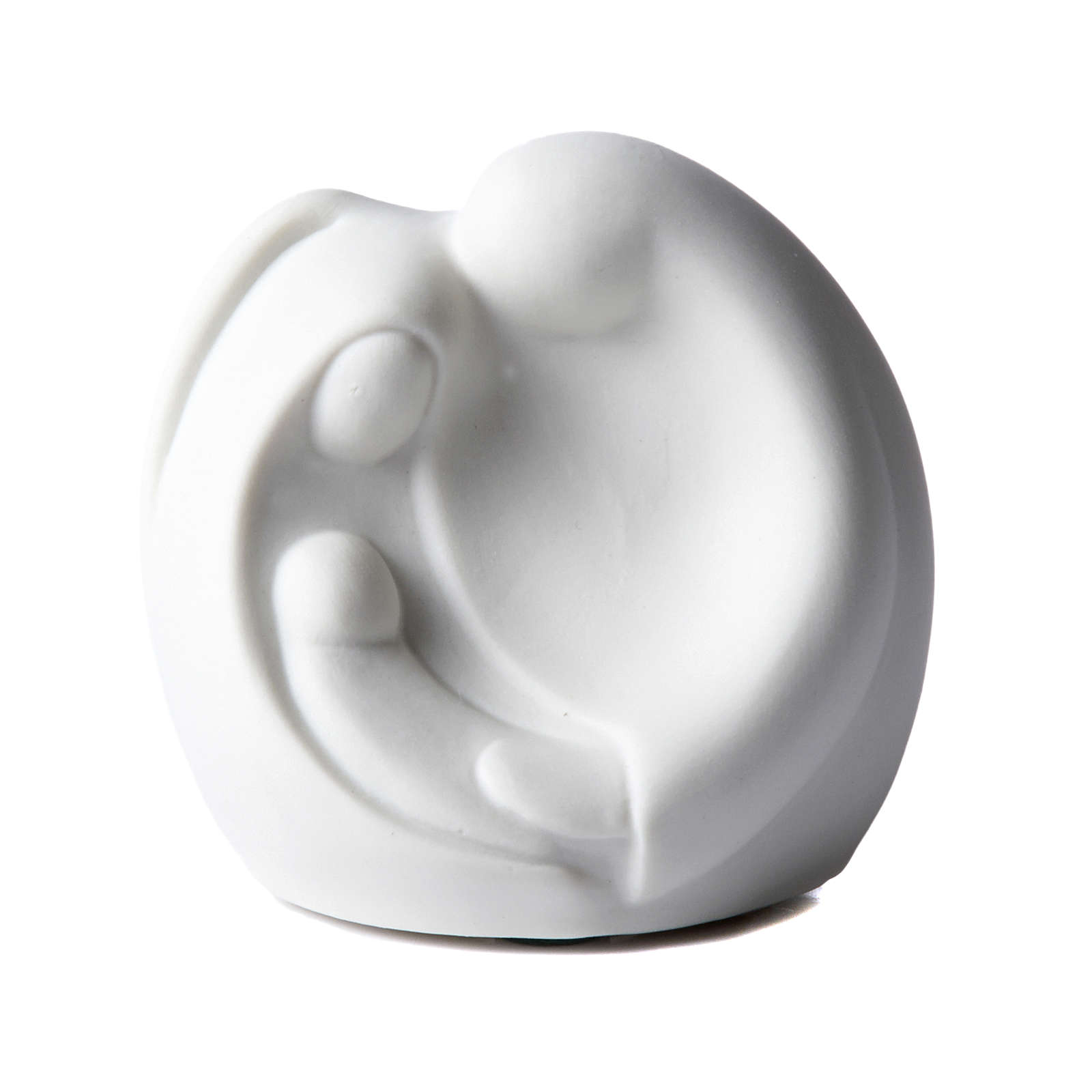 Sainte Famille, statue modèle stylisé, petite taille en porcelaine blanche sur base sombre. Les trois personnes sont unies grâce à une tendre fusion. Modèle allongé vers le haut. Réalisée par F. Pinton. Article élégant, simple et les traits restent légers.