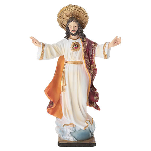 Représentation en résine du Sacré-Cœur de Jésus, vêtu d'un habit long clair et d'un manteau rouge orné de décors dorés. Les bras sont ouverts en geste d'accueil et le corps avance légèrement dans une posture victorieuse.