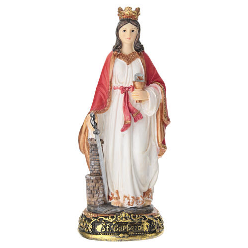 Représentation en résine moulée et peinte à la main de Sainte Barbe, vêtue d'une longue robe claire et d'un manteau rouge aux bords décorés.