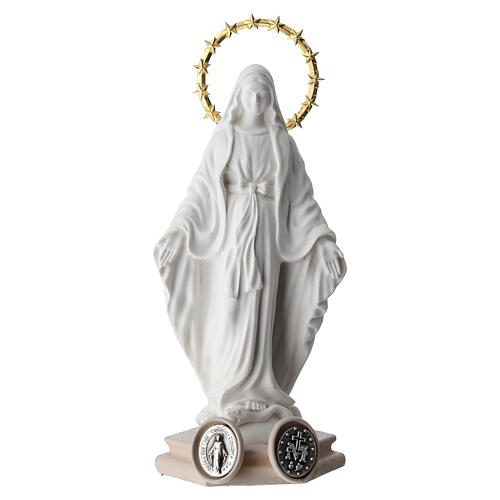 Statuette Vierge Miraculeuse en résine blanche, base ornée de médailles 10 cm.