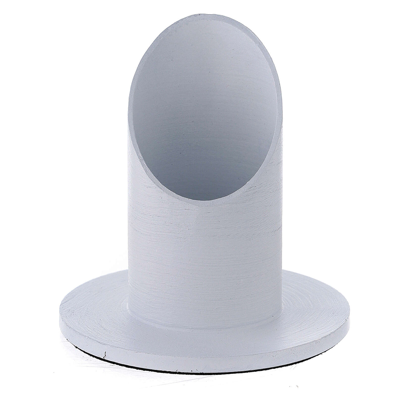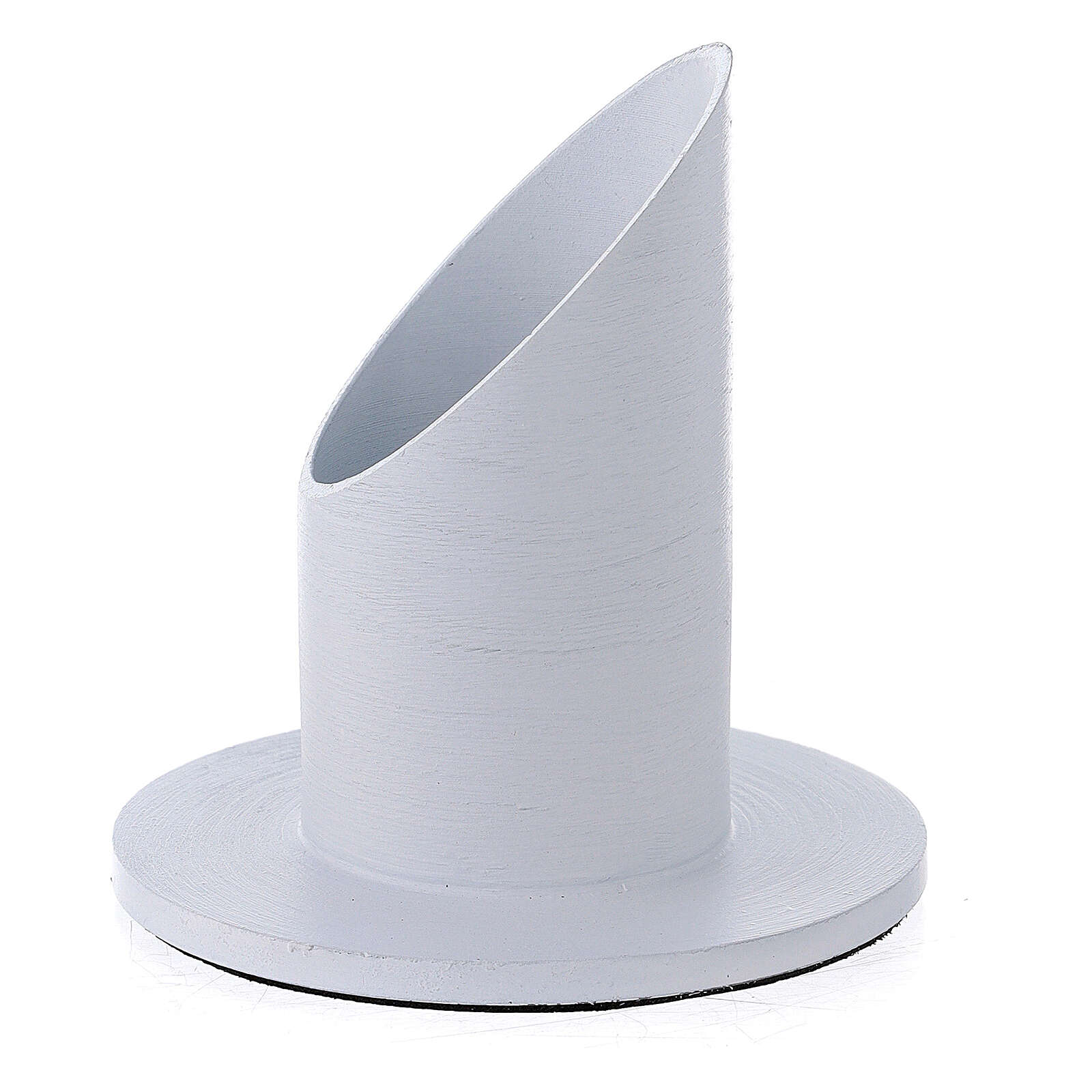 Bougeoir aluminium brossé blanc 4 cm. Bougeoir avec bocal oblique de 4 cm de diamètre, réalisé en aluminium satiné et peint en blanc, adapté pour un usage domestique et liturgique.