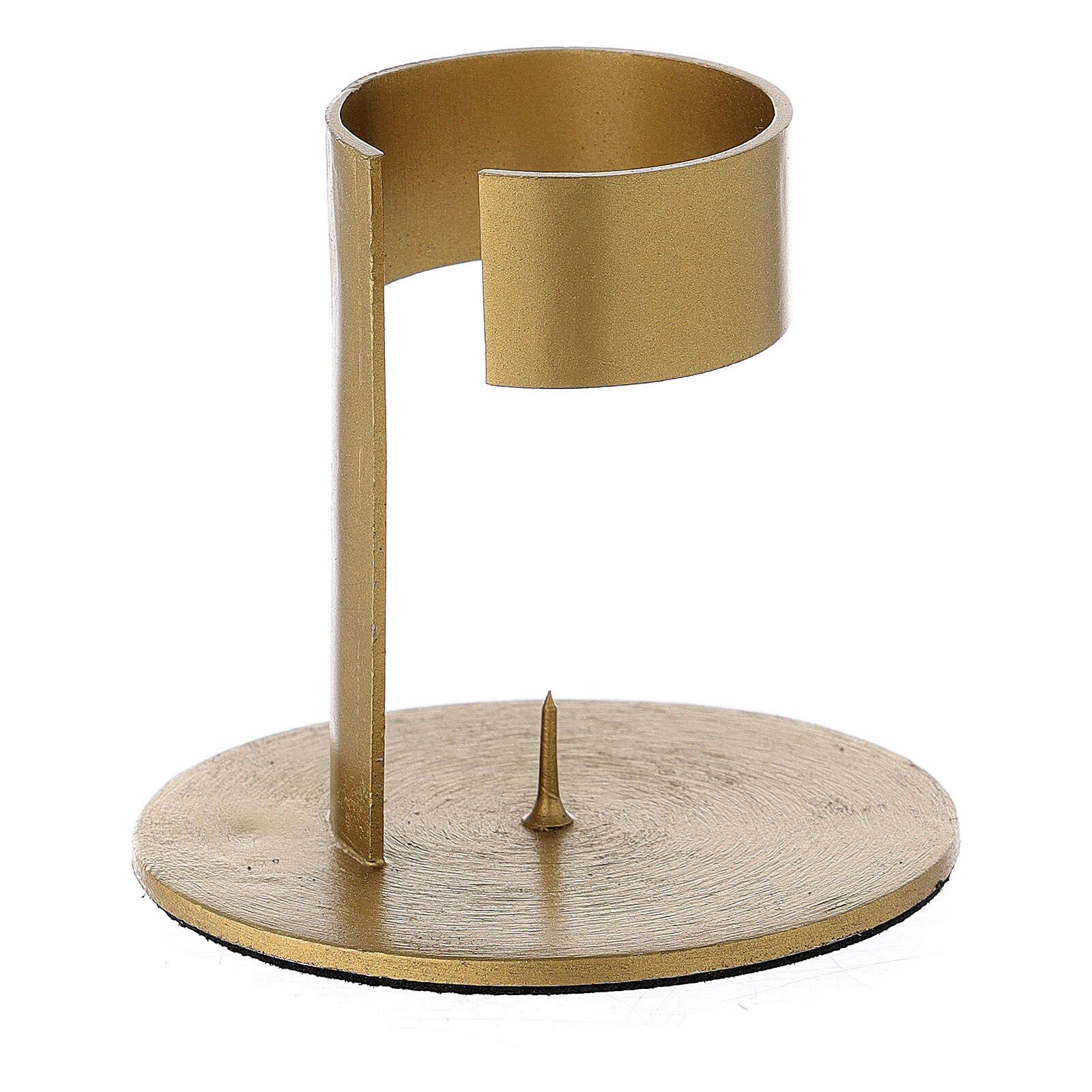Bougeoir aluminium doré bande 4 cm. Bougeoir en aluminium doré satiné composé d'une base circulaire avec pic central et d'une bande vertical avec bocal ouvert, enveloppant et soutenant la bougie.