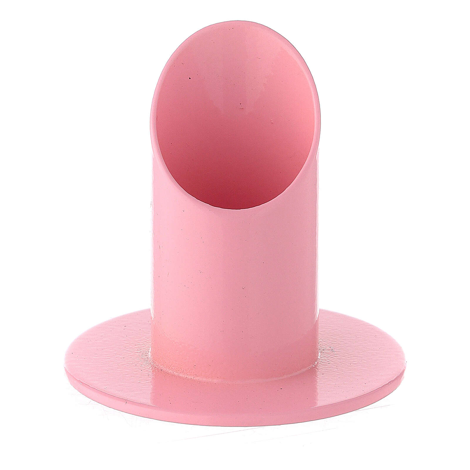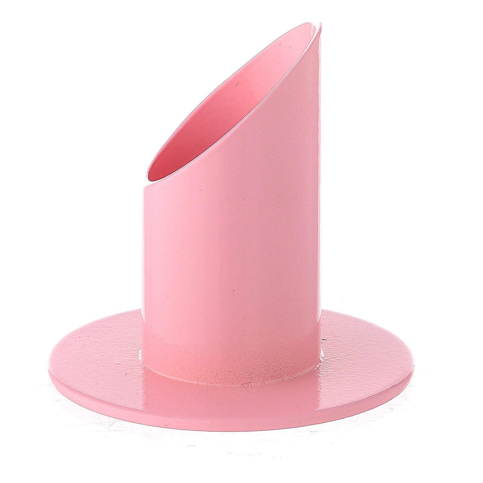 Bougeoir rose pastel fer 4 cm. Bougeoir avec bocal rond de coupe oblique, réalisé en fer peint dans une délicate couleur rose pastel, adapté pour un usage liturgique ou domestique.