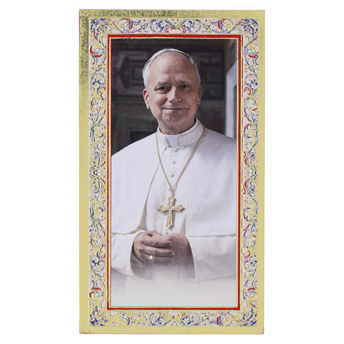 L'image représente le pape Léon XIV, d'après la photographie officielle de son élection. Au verso figure une prière dédiée au pape Léon XIV en italien, destinée à accompagner les moments de dévotion personnelle et de recueillement.
