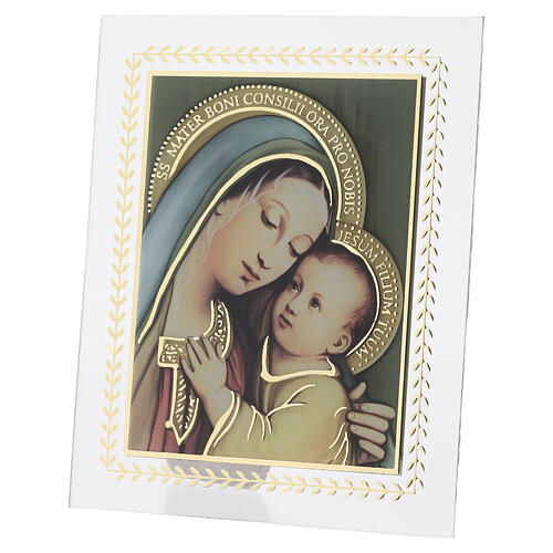 Tableau sacré avec impression haute définition sur support en verre (image de 21x17 cm). Représentation rapprochée de la Vierge du Bon Conseil avec l'Enfant, aux tonalités douces de vert, or et beige, agrémentée d'auréoles décoratives et d'un cadre gravé.
