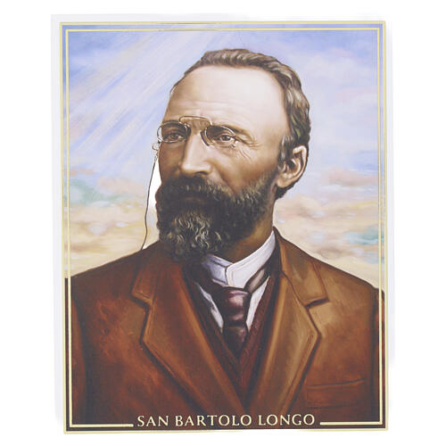 Composition rectangulaire présentant l'image de Saint Bartolo Longo aux tonalités chaudes, avec une surface travaillée de détails picturaux sur fond décoré.