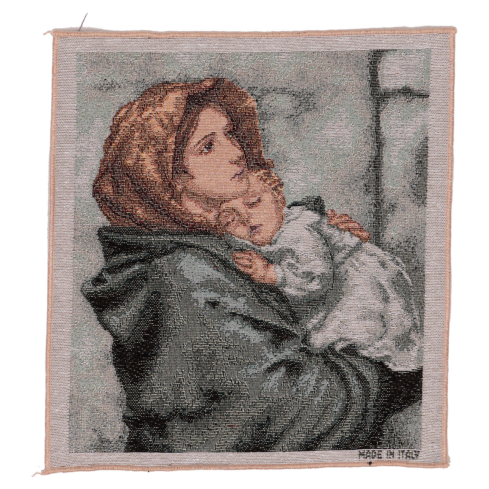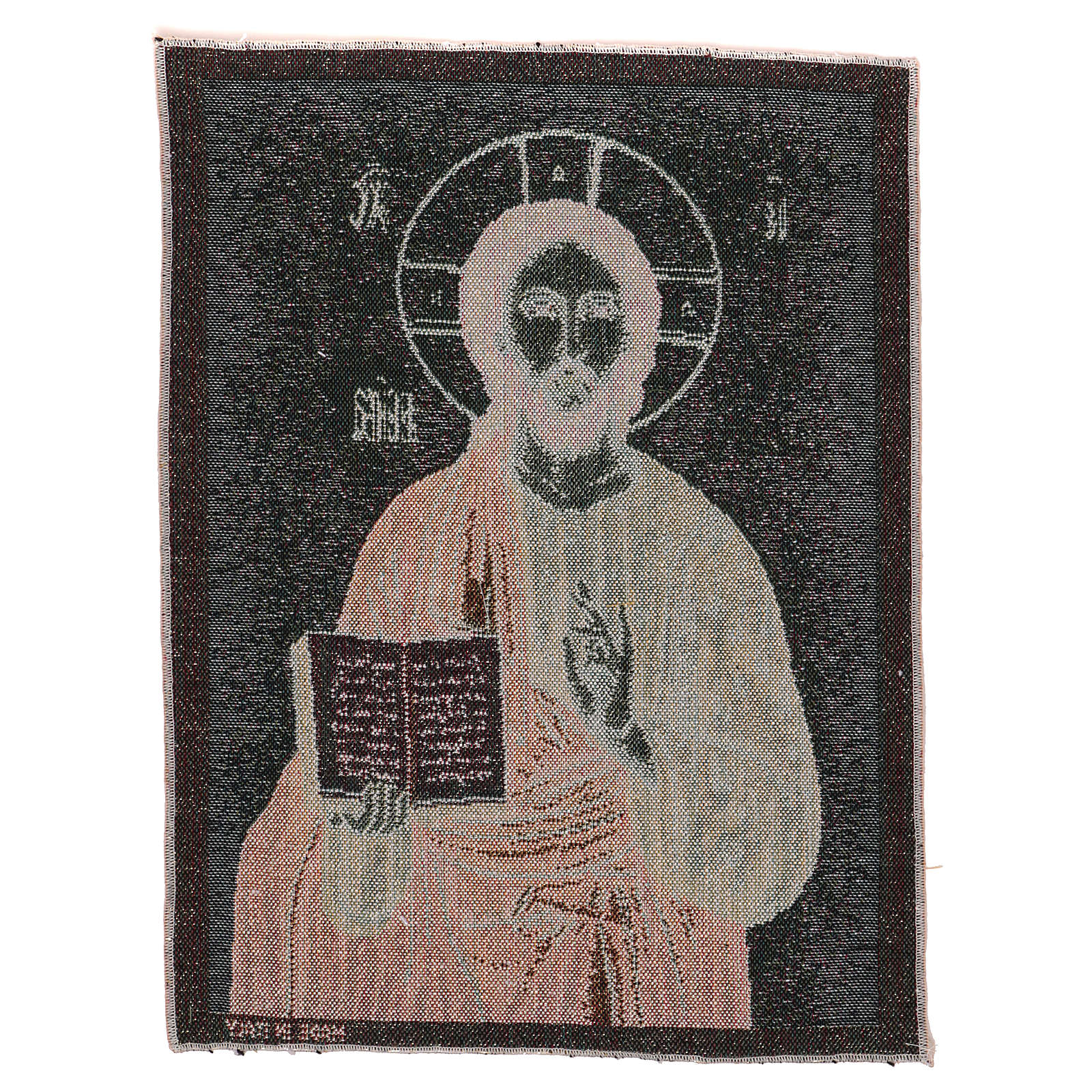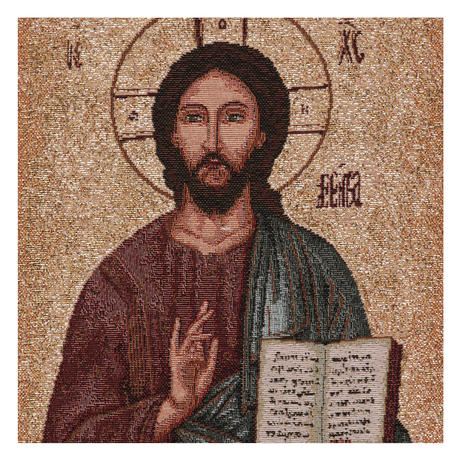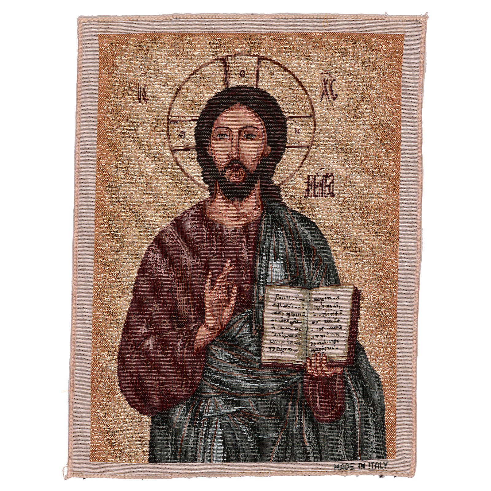 Tapisserie icône Pantocrator or 40x30 cm. Tapisserie en tissu Jacquard du Christ Pantocrator sur fond doré, entièrement confectionnée en Italie. Produit fini à la main.