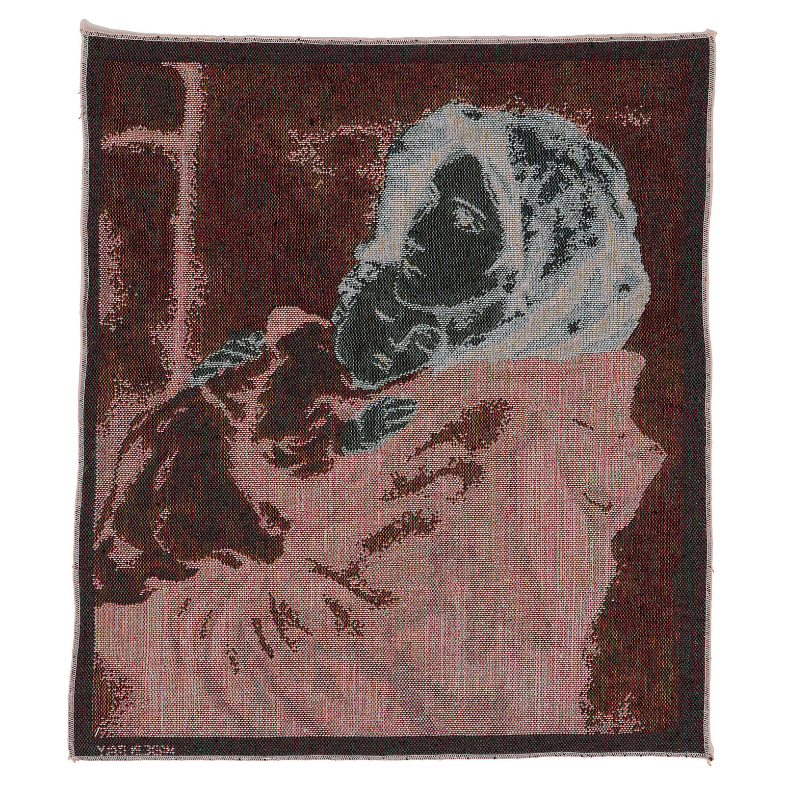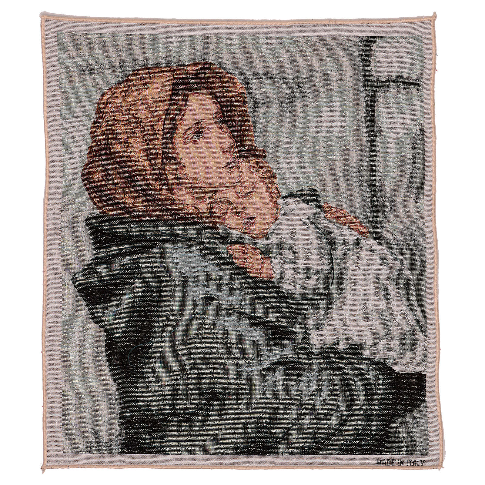 Tapisserie Madonnina Ferruzzi 45x40 cm. Tapisserie en tissu Jacquard entièrement confectionnée en Italie et finie à la main, représentant la Madonnina de Ferruzzi.