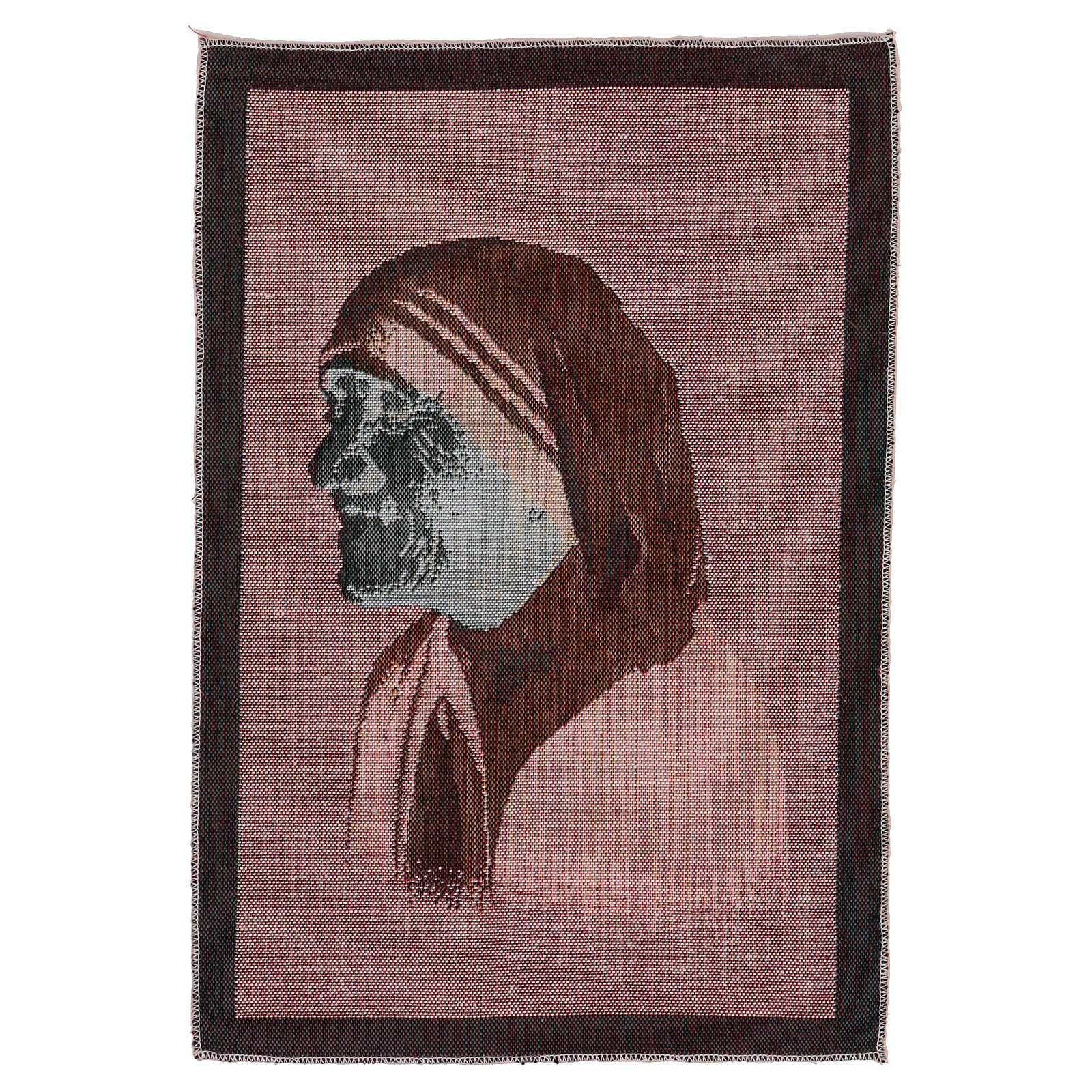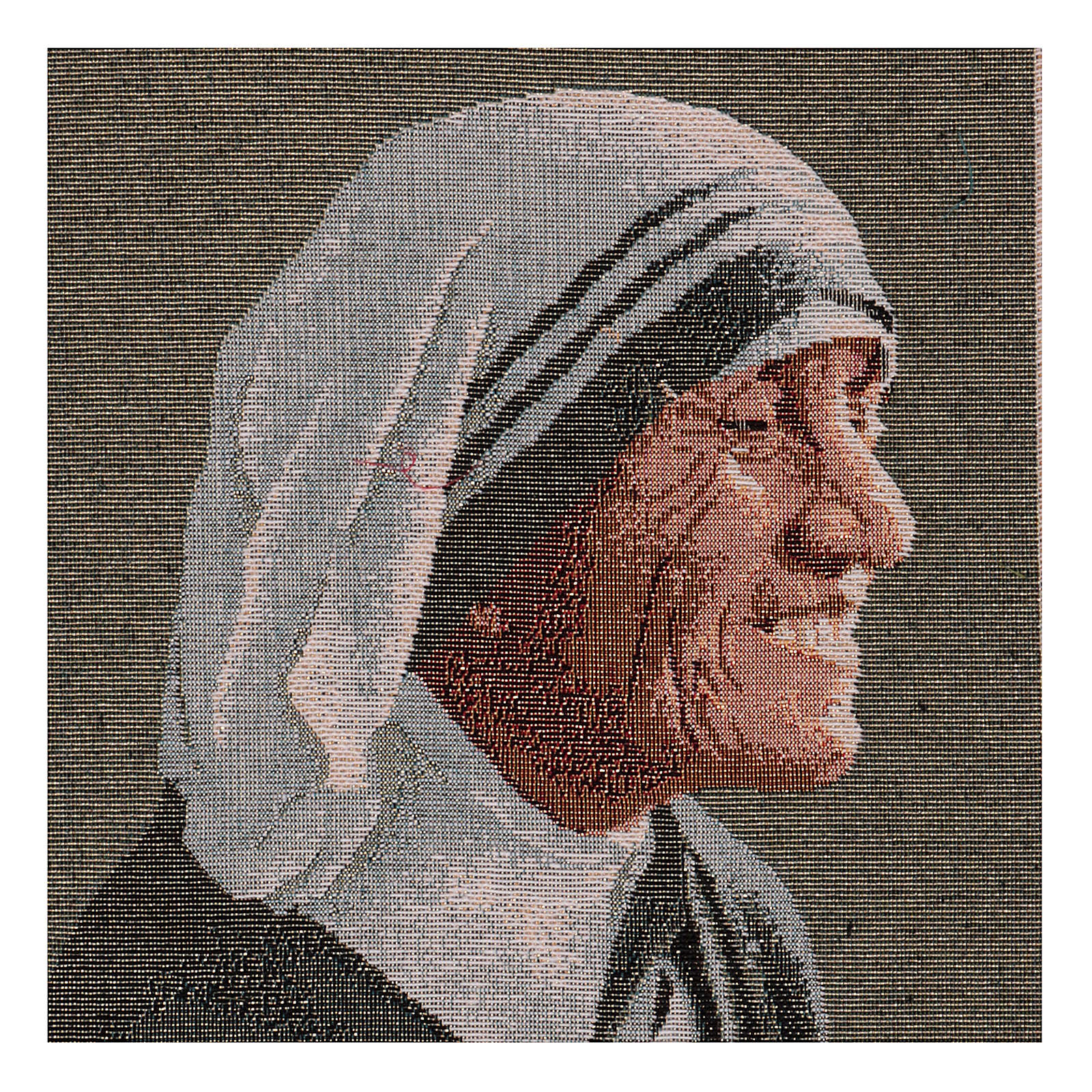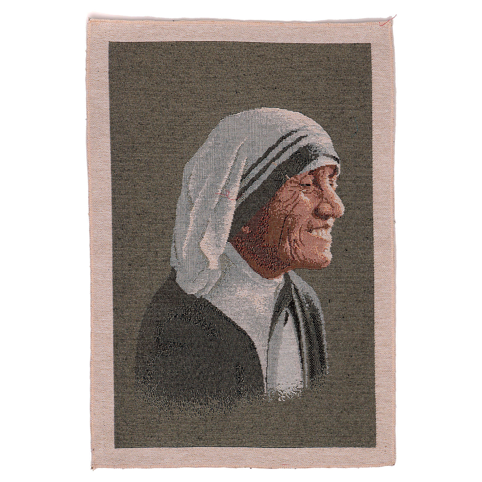Tapisserie Mère Teresa de Calcutta 50x40 cm. Tapisserie en tissu Jacquard entièrement confectionnée en Italie et finie à la main, représentant Mère Teresa.