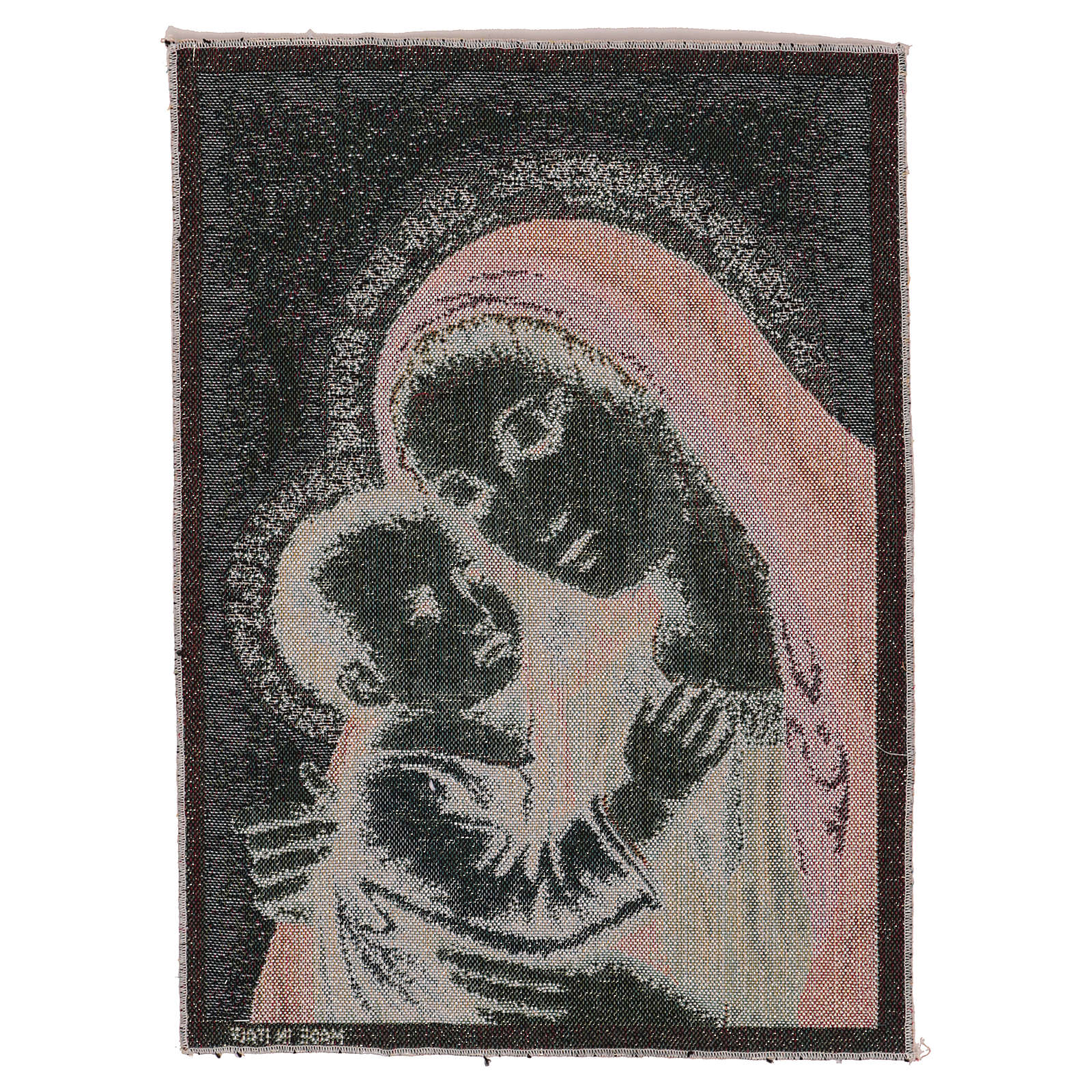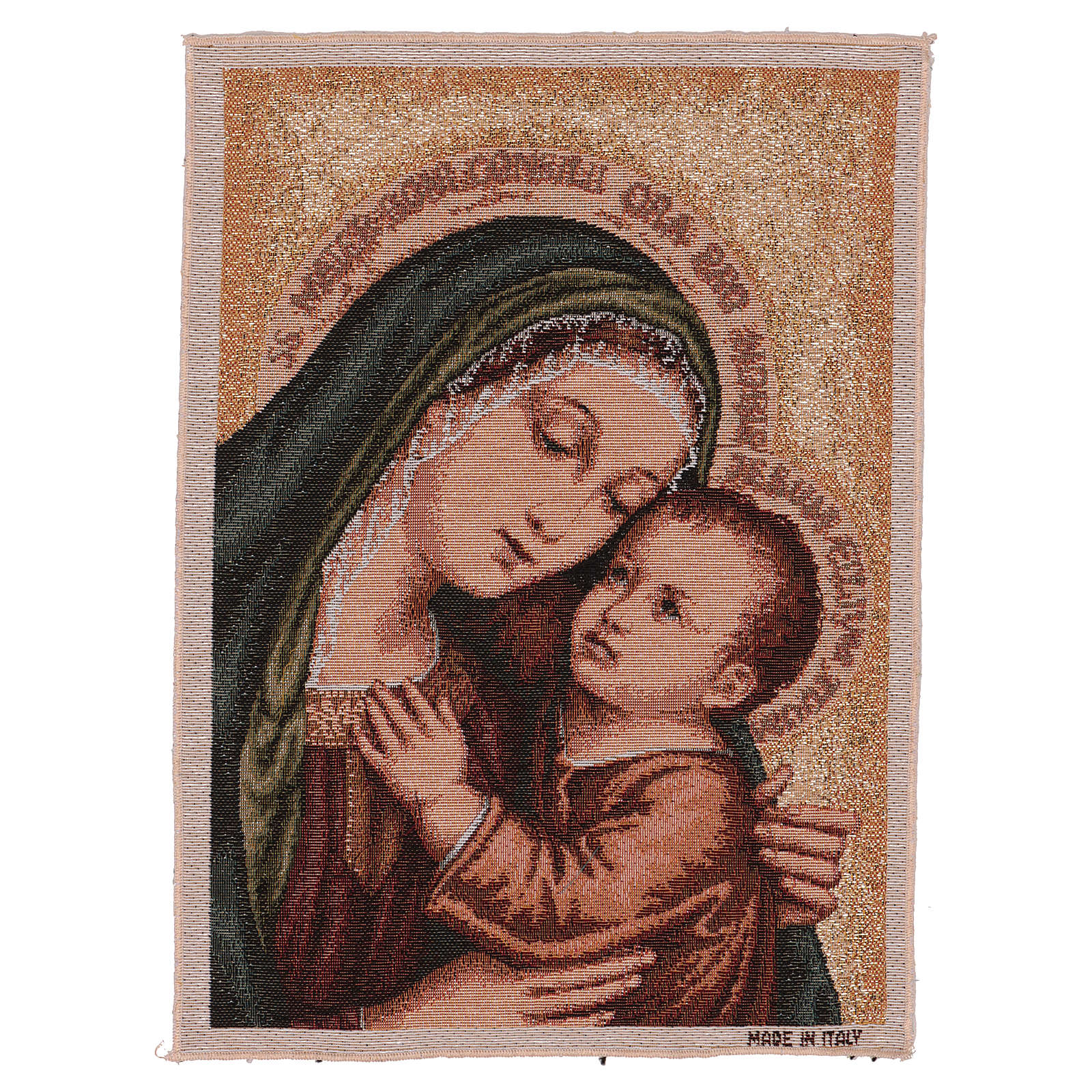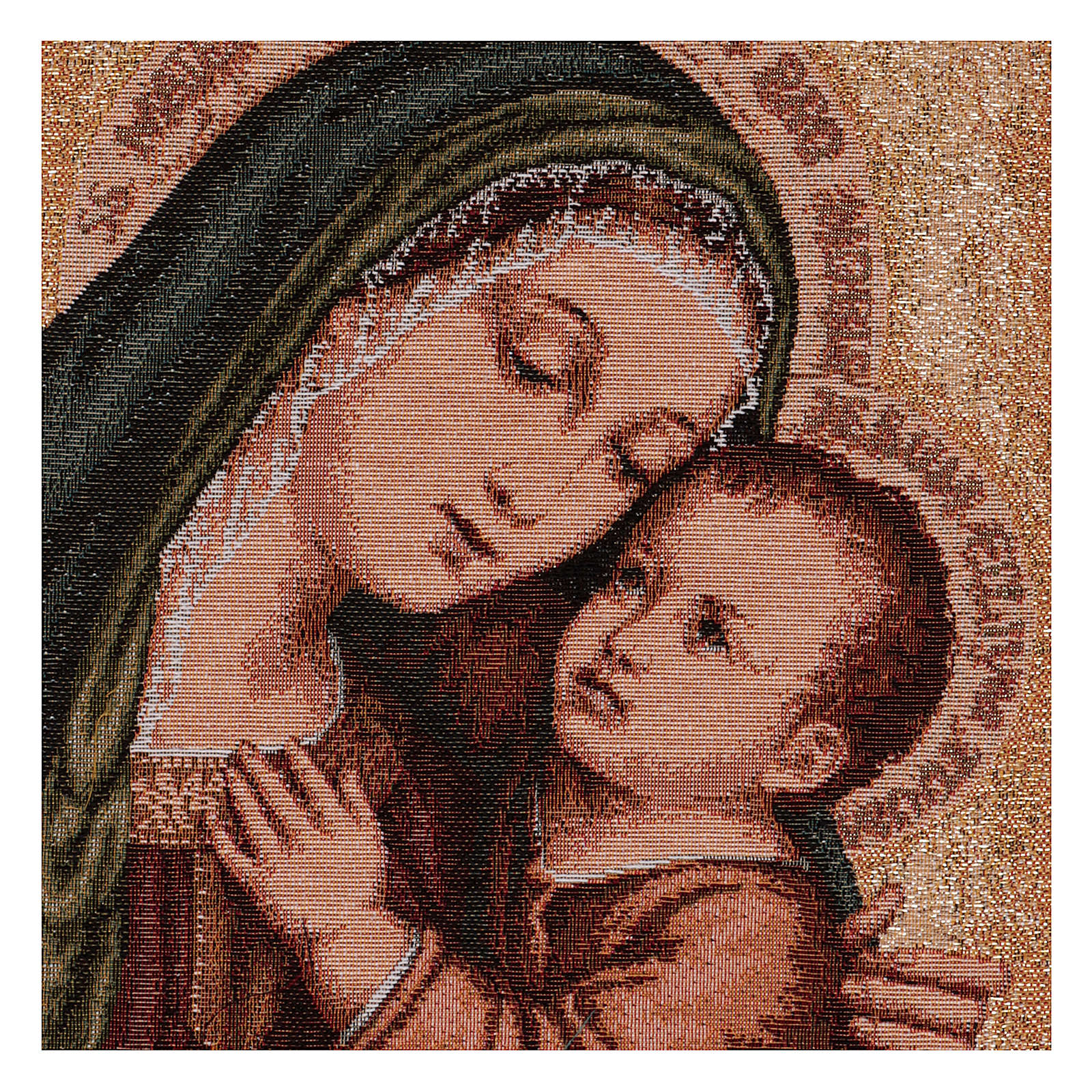 Tapisserie Notre-Dame du Bon Conseil or 40x30 cm. Tapisserie en tissu Jacquard de Notre-Dame du Bon Conseil sur fond doré, entièrement confectionnée en Italie. Produit fini à la main.