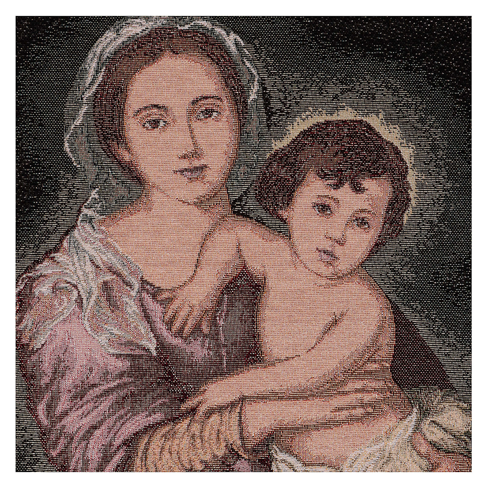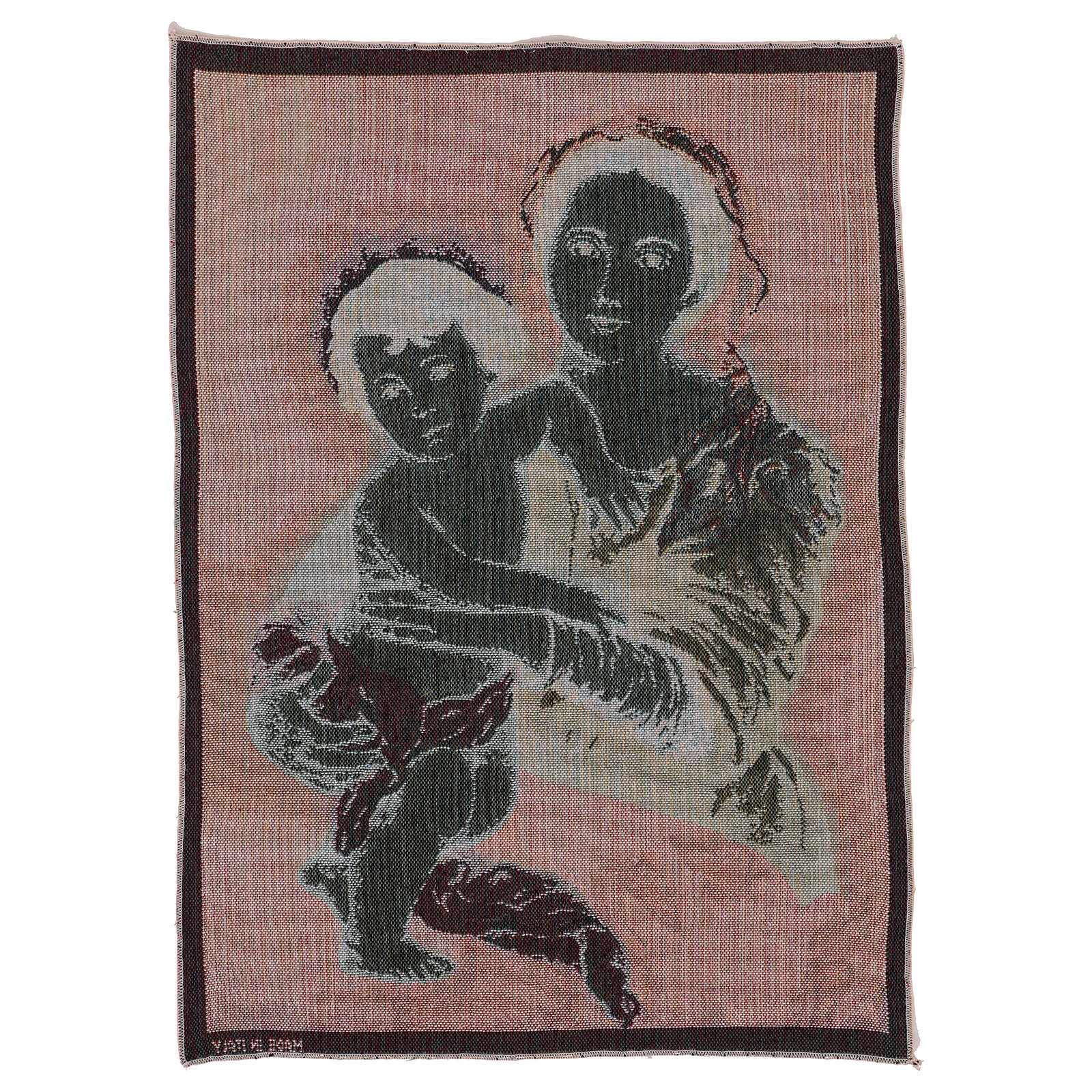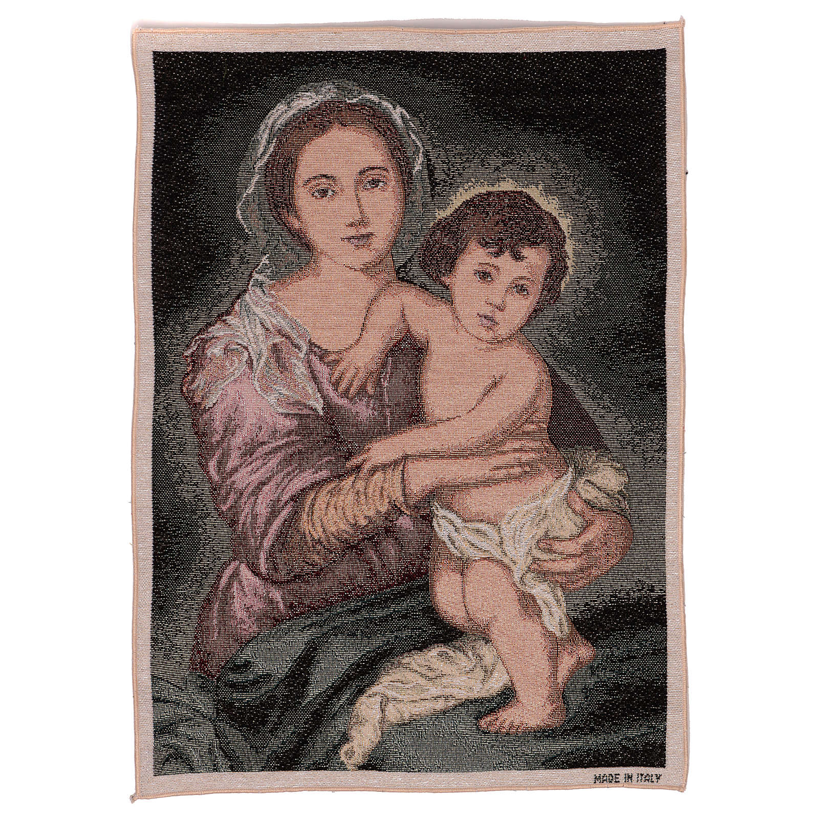 Tapisserie Vierge à l'Enfant Murillo 50x40 cm. Tapisserie en tissu Jacquard entièrement confectionnée en Italie et finie à la main, représentant la Vierge à l'Enfant de Murillo.
