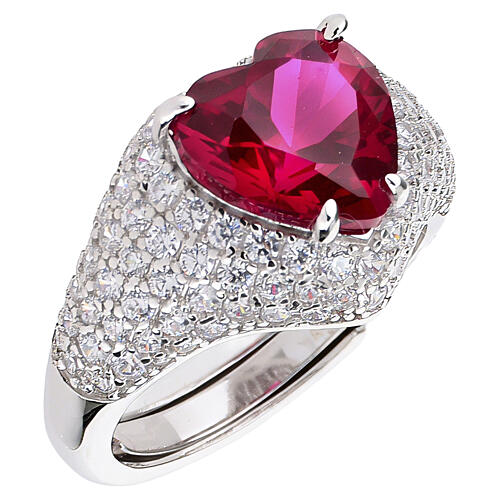 Bague réglable en argent 925, ornée d'un zircon rouge cerise en forme de cœur de 10 mm, serti sur un chaton central entouré d'un pavé de zircons blancs.