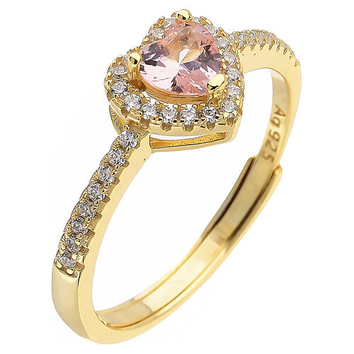 Bague réglable avec zircon central taille cœur de 5 mm couleur morganite rose, finition or, réalisée en argent 925 avec tige ouverte.