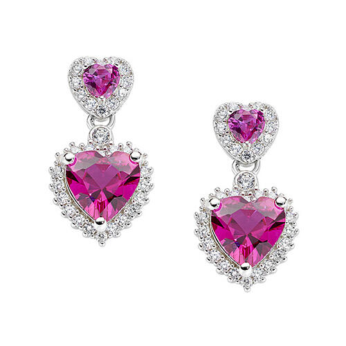 Boucles d'oreilles double cœur zircon rouge AMEN argent 925. Set de deux boucles d'oreilles AMEN en argent 925 rhodié, caractérisées par deux cœurs suspendus encadrés de zircons blancs et d'un zircon rouge central taillé en cœur de 7 mm de diamètre.
