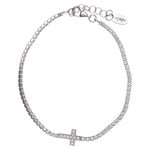 Bracelet Amen rivière croix et zircons. Bracelet rivière de la marque Amen en argent 925 rhodié avec zircons blancs et croix centrale, doté d'un fermoir mousqueton et d'une chaînette de 2,5 cm.