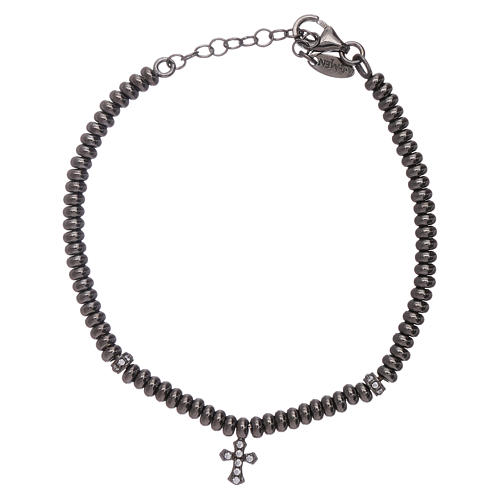 Bracelet argent 925 rhodié noir et croix AMEN. Bracelet en argent 925 rhodié noir avec perles rondes aplaties de 2-3 mm, 2 perles en forme d'anneaux et croix pendentif avec zircons blancs.