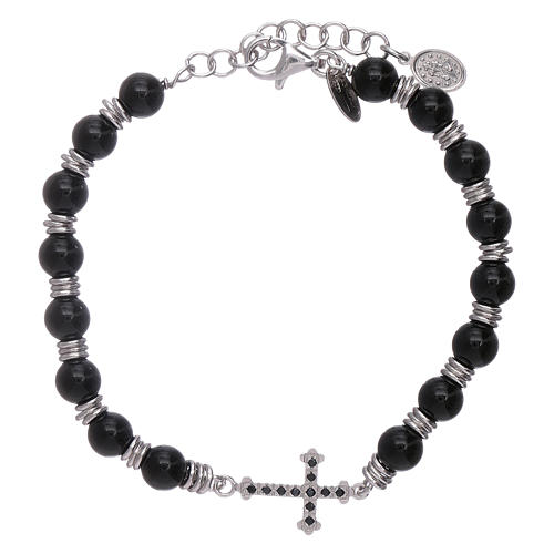 Bracelet en ónix et argent 925 AMEN croix de zircons. Bracelet pour homme en argent 925, caractérisé par une croix avec zircons noirs appliquée en ligne avec la chaîne, perles en ónix brillant noir de 5 mm séparées par des anneaux rhodiés.