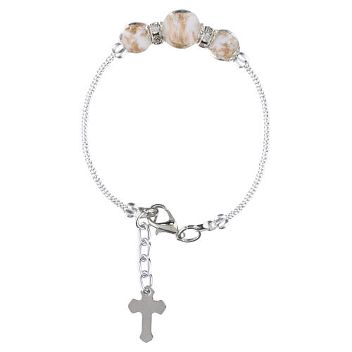 Composé de perles de 10 mm en verre de Murano blanc, ce bracelet présente un alignement linéaire de perles avec une petite croix argentée intégrée parmi les éléments décoratifs.