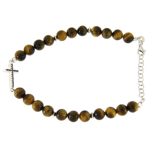 Bracelet grains oeil de tigre 6,5 mm croix appliquée zircons noirs argent 925