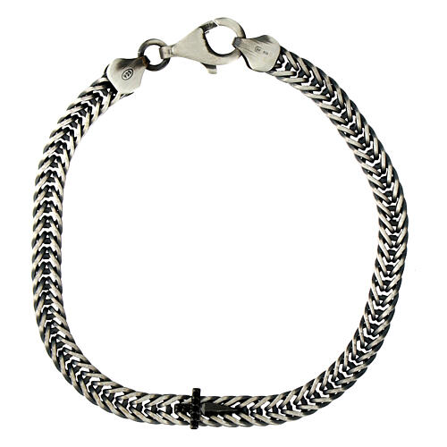 Bracelet Agios argent fin. ruthénium avec croix et zircons noirs. Bracelet de la collection Sagitta Crucis de la marque artisanale toscane Agios, réalisé en argent 925 avec, au centre, une croix composée de 7 zircons noirs.