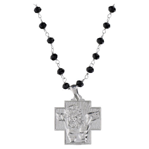 Collier avec pendentif en forme de croix avec Christ crucifié en relief au centre. La chaîne est composée de grains à facettes en cristal noir de 4 mm.