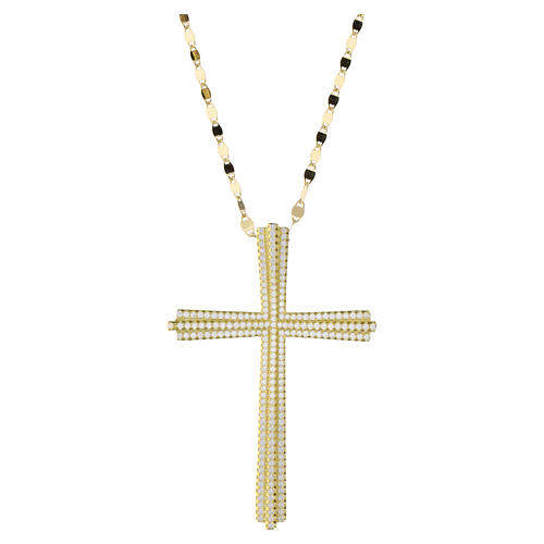 Collier doré avec une grande croix pendentif en argent 925 plaqué or. La croix, à reliefs, est entièrement pavée de zircons blancs de 5,5x3,8 cm et pend à une chaîne brillante à finition miroir.