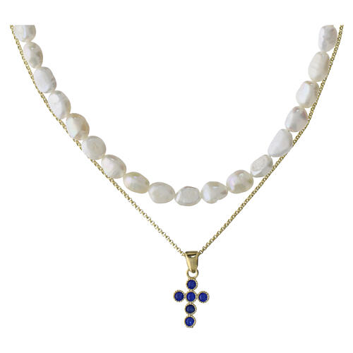 Collier composé de deux rangs : un tour de perles naturelles de forme irrégulière et une chaîne dorée avec une croix pendante sertie de zircons bleus. L'ensemble est réalisé en argent sterling à finition dorée.