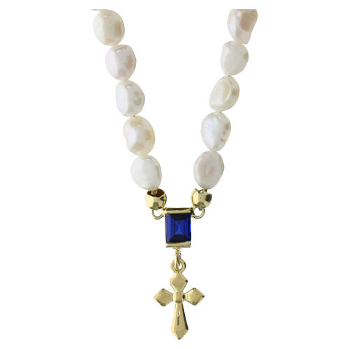 Collier perles naturelles croix dorée zircon bleu Benedictus argent 925