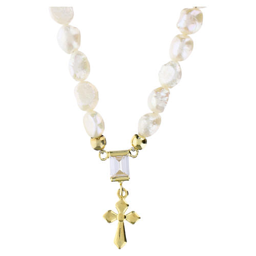 Collier composé d'un rang de perles naturelles de forme irrégulière. Au centre se trouve un zircon blanc brillant taille baguette, accompagné d'une croix pendentif dorée. Le collier est en argent sterling plaqué or et fabriqué en Italie.