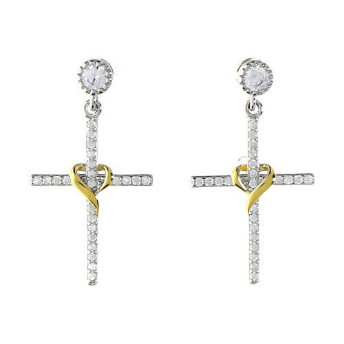 Pendant d'oreilles Illumina argent 925 et zircons blancs Agios. Boucles d'oreilles en argent 925 rhodié avec croix sertie de zircons blancs et centre enrichi d'un coeur stylisé en finition dorée qui entoure le croisement des bras.