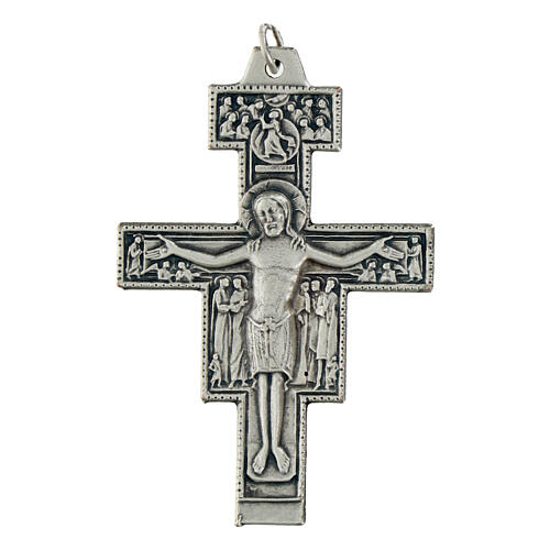 Croix pendentif St Damien en métal argenté 5.8 cm. Inscription sur le derrière Assisi et phrase.