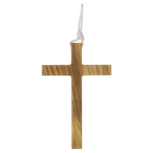 Croix allongée 8.5x5.5 cm Première Communion bois olivier. Croix en bois d'olivier de 8.5x5.5 cm, adapté pour la Première Communion, attachée à un cordon blanc de longueur réglable.