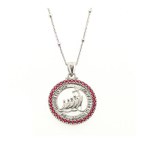 Collier Jubilé 2025 Agios zircons rouges argent 925. Ras-de-cou avec médaille représentant le logo officiel du Jubilé 2025 Pèlerins d'Espérance, réalisé en argent 925 avec finition rhodiée. Le logo est encadré par une file de zircons rouges, placé au centre d'une médaille circulaire de 22 mm de diamètre.