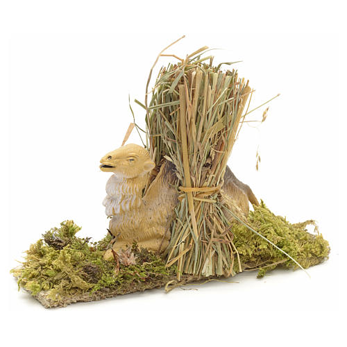 Statuette crèche Noël en plastique, chameau avec foin. Santon pour crèche de 10 cm en plastique peinte, bois, foin et base en liège et mousse végétale. Statuette complètement réalisé en Italie avec matériaux atoxiques.